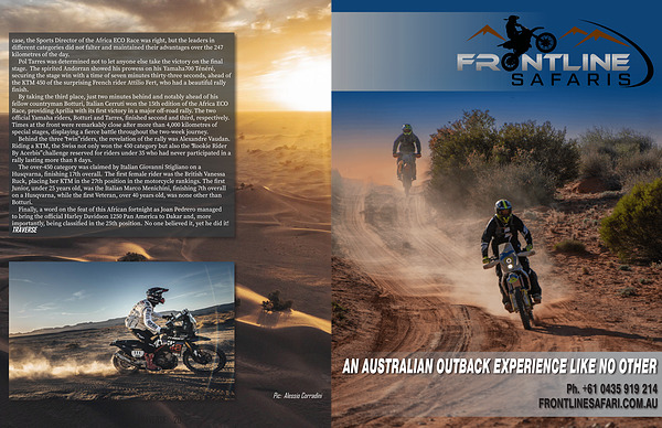 By taking the third place , just two minutes behind and notably ahead of his fellow countryman Botturi , Italian Cerruti won the 15th edition of the Africa ECO Race , providing Aprilia with its first victory in a major off-road rally . The two official Yamaha riders , Botturi and Tarres , finished second and third , respectively . Times at the front were remarkably close after more than 4,000 kilometres of special stages , displaying a fierce battle throughout the two-week journey .