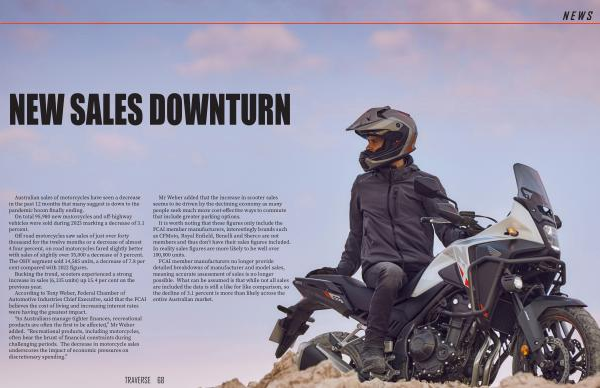 “ As Australians manage tighter finances , recreational products are often the first to be affected ,” Mr Weber added . " Recreational products , including motorcycles , often bear the brunt of financial constraints during challenging periods . The decrease in motorcycle sales underscores the impact of economic pressures on discretionary spending .”