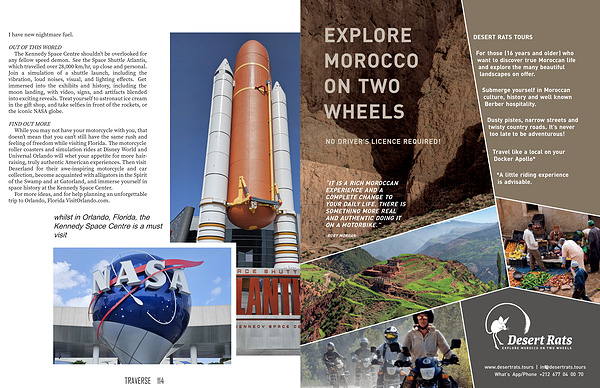 While you may not have your motorcycle with you , that doesn ’ t mean that you can ’ t still have the same rush and feeling of freedom while visiting Florida . The motorcycle roller coasters and simulation rides at Disney World and Universal Orlando will whet your appetite for more hairraising , truly authentic American experiences . Then visit Dezerland for their awe-inspiring motorcycle and car collection , become acquainted with alligators in the Spirit of the Swamp and at Gatorland , and immerse yourself in space history at the Kennedy Space Center .