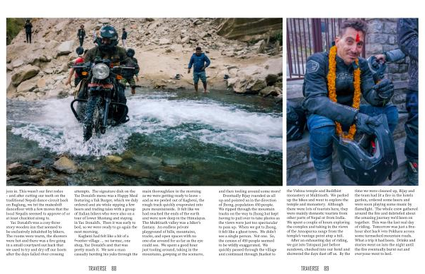 After an exhausting day of riding , we got into Tatopani just before sundown , checked into our hotel and showered the days dust off us . By the time we were cleaned up , Bijay and the team had lit a fire in the hotels garden , ordered some beers and were soon playing some music by flamelight . The whole crew gathered around the fire and debriefed about the amazing journey we ’ d been on together . This was the last real day of riding . Tomorrow was just a fivehour shot back into Pokhara across some tarmacked mountain roads . What a trip it had been . Drinks and stories went on into the night until the fire eventually burnt out and everyone went to bed .