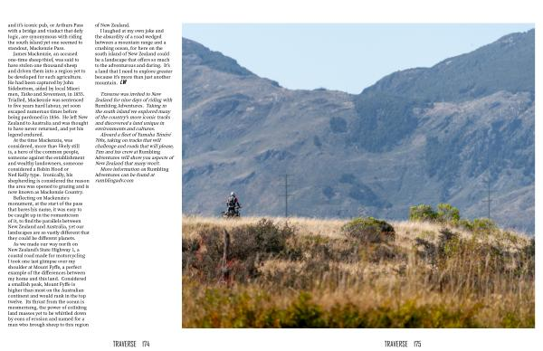 Traverse was invited to New Zealand for nine days of riding with Rumbling Adventures . Taking in the south island we explored many of the country ' s more iconic tracks and discovered a land unique in environments and cultures .