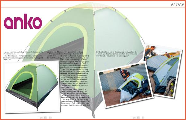 Sufficient for one or two nights in the still desert air , the Anko twoperson tent will get you by , although the thin single membrane struggles to keep out cold and even damp night air . Construction is as the price would suggest cheap … and a little nasty . We know plenty of adventure riders who purchase these things in the hope that