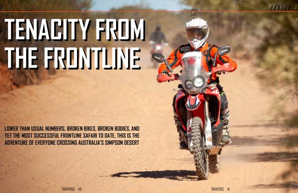 LOWER THAN USUAL NUMBERS , BROKEN BIKES , BROKEN BODIES , AND YET THE MOST SUCCESSFUL FRONTLINE SAFARI TO DATE , THIS IS THE ADVENTURE OF EVERYONE CROSSING AUSTRALIA ' S SIMPSON DESERT