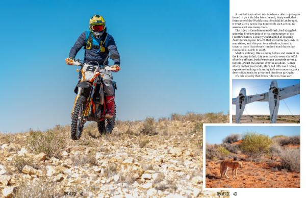 Mark is military , like so many before and current on the Frontline Safari , this year has also seen a handful of police officers , both former and currently serving , for this is what the annual event is all about . Unlike others on this year ’ s ride , Mark had little sand riding experience making a daunting task even more so , yet a determined tenacity prevented him from giving in . It ’ s this tenacity that drives riders to cross such