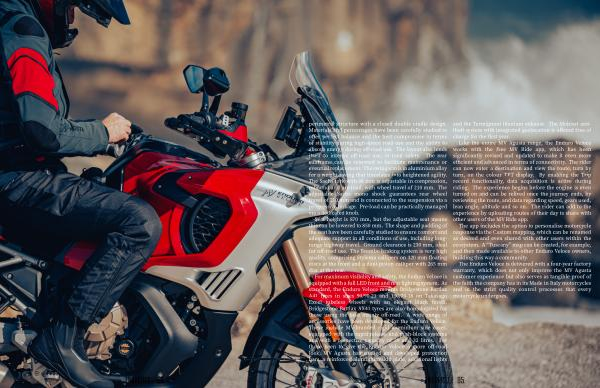 Like the entire MV Agusta range , the Enduro Veloce works with the free MV Ride app , which has been significantly revised and updated to make it even more efficient and advanced in terms of connectivity . The rider can now enter a destination and view the route , turn by turn , on the colour TFT display . By enabling the Trip record functionality , data acquisition is active during riding . The experience begins before the engine is even turned on and can be relived once the journey ends , by reviewing the route , and data regarding speed , gears used , lean angle , altitude and so on . The rider can add to the experience by uploading routes of their day to share with other users of the MV Ride app .