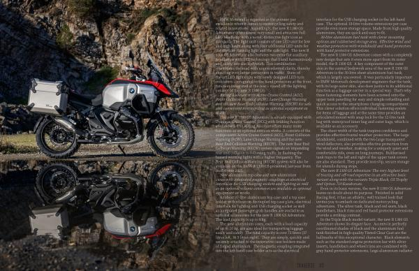 BMW Motorrad is regarded as the pioneer par excellence when it comes to motorcycling safety and related innovations . Accordingly , the new R 1300 GS Adventurer offers a new , very small and attractive full LED headlamp with a novel , distinctive light icon as standard . The light unit consists of one LED unit for low and high beam along with four additional LED units for the daytime running light and the side light . The new R 1300 GS Adventure also features two extra-flat auxiliary headlamps with LED technology that blend harmoniously and safely into the bodywork . This combination illuminates the road with unprecedented clarity , thereby ensuring even better perception in traffic . State-ofthe-art LED light units with newly designed LED turn indicators – integrated in the hand protectors at the front , function-integrated at the rear – round off the lighting concept of the new R 1300 GS .