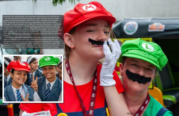 We were the only Australians amongst the teams , all others from the United Kingdom , and all embracing the spirit of the event . Costumes were plentiful . Mario and Luigi ’ s sisters had turned up , resplendent in their work overalls , although it ’ s a brave plumber who decides to work on Indian drains . A surfboard sat atop one such rickshaw , although we ’ d beg to question whether any Brit has actually seen a surf beach . A giant rubber ducky sat on top of a trio tri-wheeled machine , father and two sons quacking their way to Mumbai . Of course , football teams and favourite rock bands were represented . And of course , we Aussies chose the middle package that neglected to include wild paint schemes and plush seating .