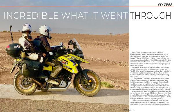 Ollie Gamblin and Lavi Scholl have set a new Guinness world record , becoming the youngest pair to circumnavigate the world on a motorcycle , two-up . On a Suzuki V-Strom 1050XT , they visited 39 countries on five continents and covered over 75,000 kilometres in 589 days . Now 33 and 35 , the duo were 32 and 34 upon completion of their adventure , with the record their average age of 33 years and 247 days .