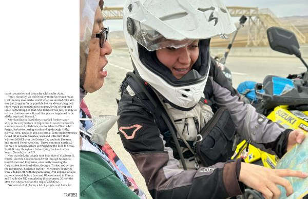 After landing in Brazil they travelled further south still , to the very bottom of Argentina to reach the world ’ s southernmost city , Ushuaia , on the island of Tierra del Fuego , before returning north and up through Chile , Bolivia , Peru , Ecuador and Colombia . With eight countries ticked off in South America , Lavi and Ollie flew their V-Strom 1050XT over the Darien Gap and into Panama , and entered North America . They ’ d continue north , all the way to Canada , before airfreighting the bike to Seoul , South Korea , though not before tying the knot in Las Vegas , Nevada , in the US .