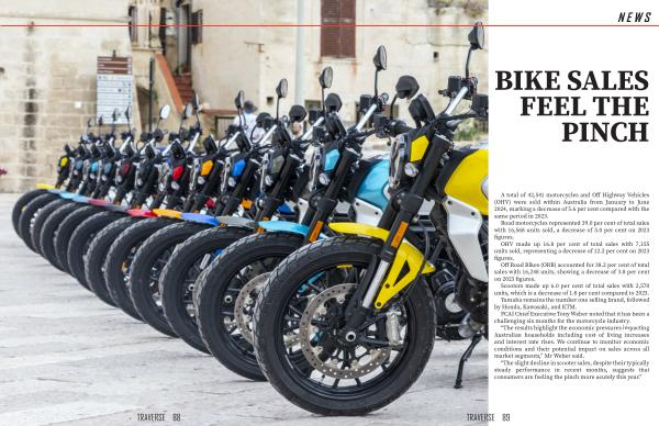 A total of 42,541 motorcycles and Off Highway Vehicles ( OHV ) were sold within Australia from January to June 2024 , marking a decrease of 5.6 per cent compared with the same period in 2023 .