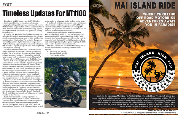 Introduced for 2022 model year , the NT1100 offers a timeless combination of desirable performance , engaging handling and long-range comfort , with a raft of the latest technologies and a sleek take on classical tourer style . This combination has proved immensely popular , gaining the NT1100 the number one spot in the touring category in 2023 .