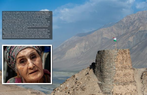 Leaving Samarkand , the RMT lead expedition takes on the second border crossing as we enter Tajikistan and look for our entry to the Pamir Highway . The border announces a noticeably clear change , the language , peoples , and culture all hugely different to that of surrounding countries . The Tajik people take their heritage from the Middle East , the Tajik language itself a derivative of Persian . The country feels different and is different .
