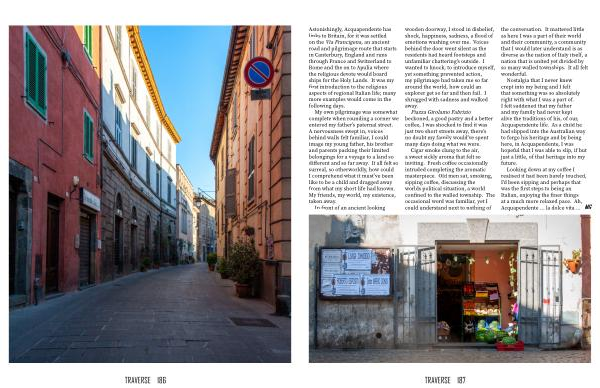 Nostalgia that I never knew crept into my being and I felt that something was so absolutely right with what I was a part of . I felt saddened that my father and my family had never kept alive the traditions of his , of our , Acquapendente life . As a child he had slipped into the Australian way to forgo his heritage and by being here , in Acquapendente , I was hopeful that I was able to slip , if but just a little , of that heritage into my future .