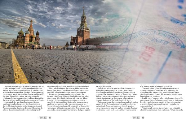 Russia was always a popular destination for the intrepid rider , Trans-Siberian , Road of Bones , just a few of the many rides that drew in the adventurous riding traveller . Criticism was seldom coming , onlookers cared little for the politics , the traveller was considered apolitical and someone who was merely peering in . Conversations have changed dramatically in the past few years , those willing to ride against the flow are now seen as pariahs , outcasts supporting a regime that goes against