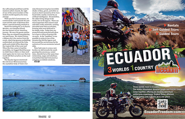 David was waiting for us in Puerto Morales , our Canadian friend , the true mentor of our American journey . We were his guests and for three days we relaxed remembering our past forays . We visited Tulum , a Mayan city a few metres from the ocean , observing iguanas sunbathing undisturbed ; we entered the Coba paths and cooled off by observing the tropical fish of the coral reef . When the time came to load the motorbike , we hugged David because we didn ’ t know where or when we ’ d meet again , but we were sure that we would still find ourselves on the road together .