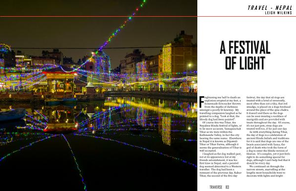 I laughed as the dog walked past , not at its appearance but at my friends astonishment , it was his first time in Nepal , and a painted dog seemed abnormal to a Western traveller . The dog had been a remnant of the previous day , Kukur Tihar , the second of the five-day festival , the day that all dogs are treated with a level of reverently , most often than not a tika , that red smudge , is placed on a dogs forehead around the place of the ajna chakra . It doesn ’ t end there as the dogs can be seen wearing a necklace of marigolds and are provided with treats throughout the day . Of course , it ’ s not just pets , stray dogs are treated well too , if for just one day .