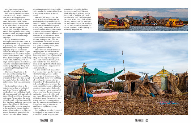 Day-to-day life went on in the golden evening light as we floated past . A few ‘ Ferraris ’ and small wooden boats were still about , but it felt very much as if with nightfall , life on the islands would slow down and go to sleep . We arrived on the main island , lovingly called ‘ the capital ’, in time for dinner and many guests took up the offer of freshly fried trout . Others opted for a cheese sandwich at the small shop , also serving hot instant drinks and coca tea . The man behind the counter seemed a little stressed , slapping sliced cheddar onto cheap toast while directing his wife to make the various drinks from a large kettle powered by a solar panel .