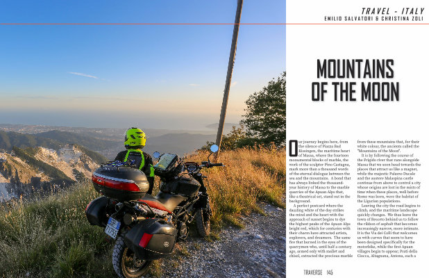 A perfect postcard where the dazzling white of the day strikes the mind and the heart with the approach of sunset begins to dye the highest peaks of the Apuan Alps bright red , which for centuries with their charm have attracted artists , explorers , and dreamers . The same fire that burned in the eyes of the quarrymen who , until half a century ago , armed only with mallet and chisel , extracted the precious marble from these mountains that , for their white colour , the ancients called the " Mountains of the Moon ".
