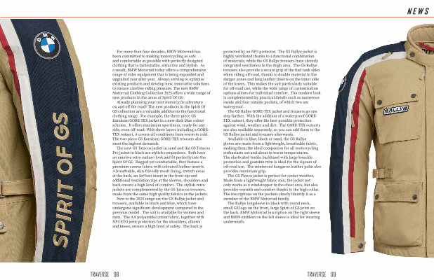 NEWS protected by an NP3 protector . The GS Rallye jacket is highly ventilated thanks to a functional combination of materials , while the GS Rallye trousers have cleverly integrated ventilation in the thigh area . The GS Rallye trousers also provide a secure grip of the fuel tank sides when riding off-road , thanks to double material in the danger zones and long leather inserts on the inner side of the knees . This makes the suit particularly suitable for off-road use , while the wide range of customisation options allows for individual comfort . The modern look is complemented by practical details such as numerous inside and four outside pockets , of which two are waterproof .