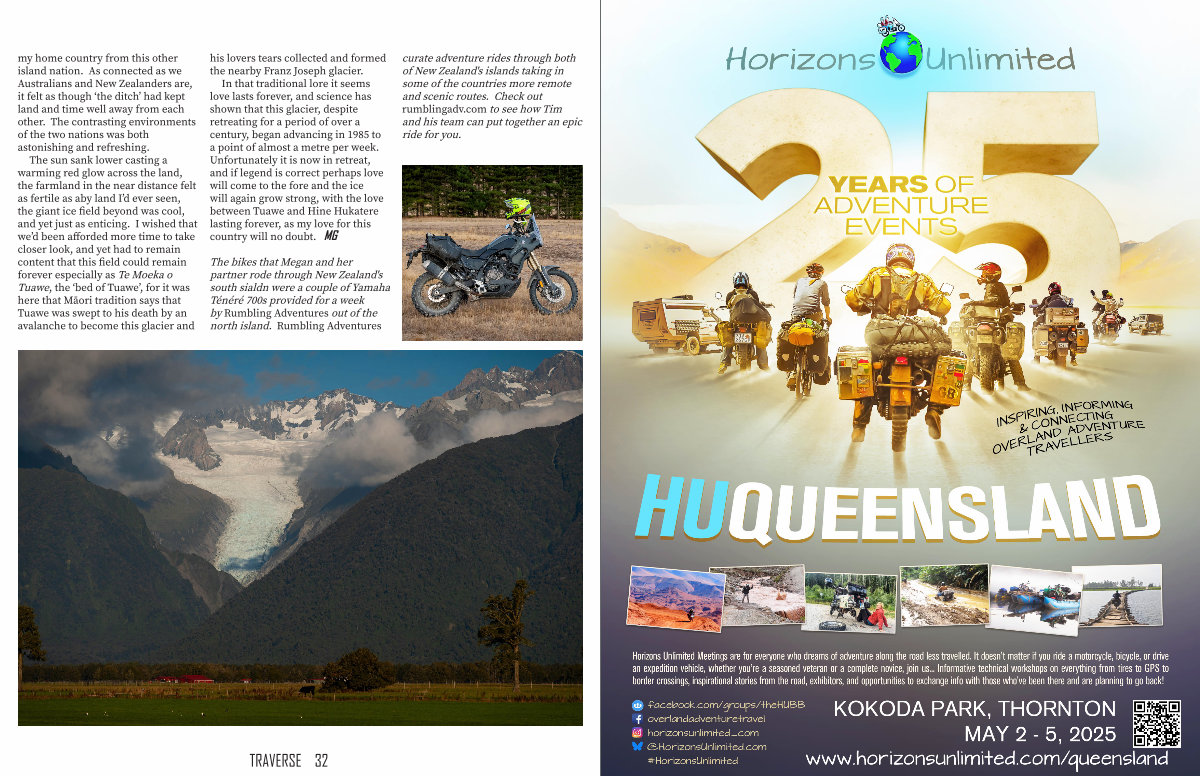 The bikes that Megan and her partner rode through New Zealand ' s south sialdn were a couple of Yamaha Ténéré 700s provided for a week by Rumbling Adventures out of the north island. Rumbling Adventures curate adventure rides through both of New Zealand ' s islands taking in some of the countries more remote and scenic routes. Check out rumblingadv. com to see how Tim and his team can put together an epic ride for you.
