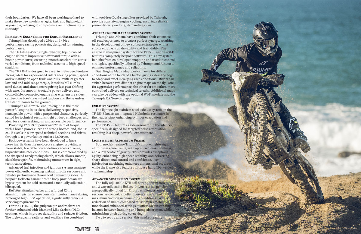 Athena Engine Management System Triumph and Athena have combined their extensive off-road experience to create a perfect synergy, resulting in the development of new software strategies with a strong emphasis on drivability and tractability. The engine management system for the TF250-E and TF450-E features completely bespoke software. This new system benefits from co-developed mapping and traction control strategies, specifically tailored by Triumph and Athena to enhance performance and reliability.