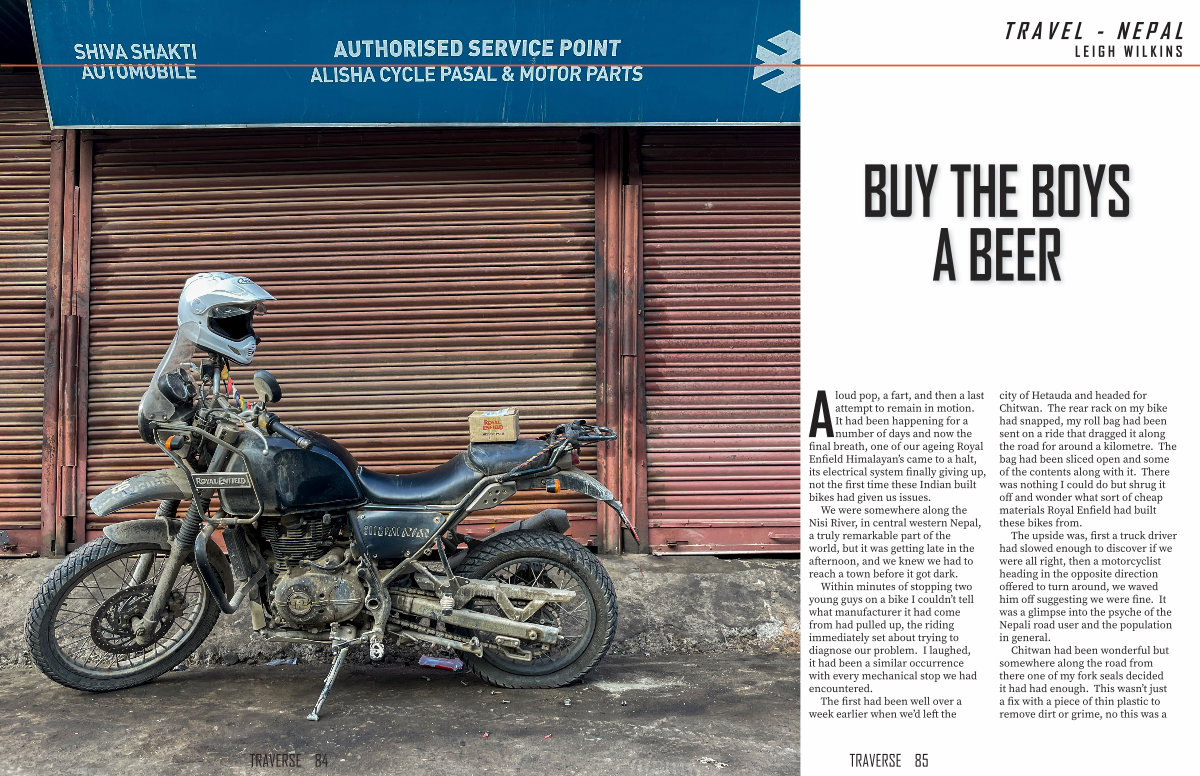 A loud pop, a fart, and then a last attempt to remain in motion. It had been happening for a number of days and now the final breath, one of our ageing Royal Enfield Himalayan’ s came to a halt, its electrical system finally giving up, not the first time these Indian built bikes had given us issues.