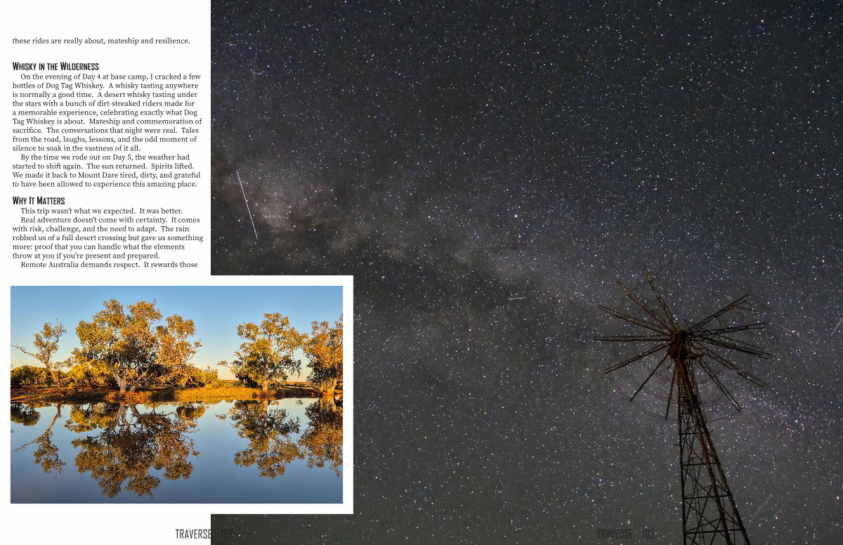 On the evening of Day 4 at base camp, I cracked a few bottles of Dog Tag Whiskey. A whisky tasting anywhere is normally a good time. A desert whisky tasting under the stars with a bunch of dirt-streaked riders made for a memorable experience, celebrating exactly what Dog Tag Whiskey is about. Mateship and commemoration of sacrifice. The conversations that night were real. Tales from the road, laughs, lessons, and the odd moment of silence to soak in the vastness of it all.