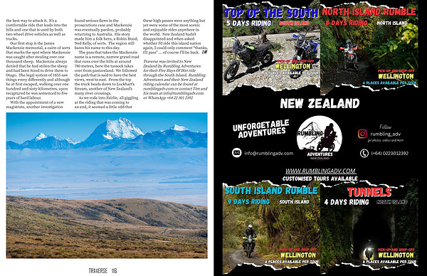 Traverse was invited to New Zealand by Rumbling Adventures for their Five Days Of Dirt ride through the South Island. Rumbling Adventures and their New Zealand riding calendar can be found at rumblingadv. com or contact Tim and his team at info @ rumblingadv. com or WhatsApp + 64 22 301 2392