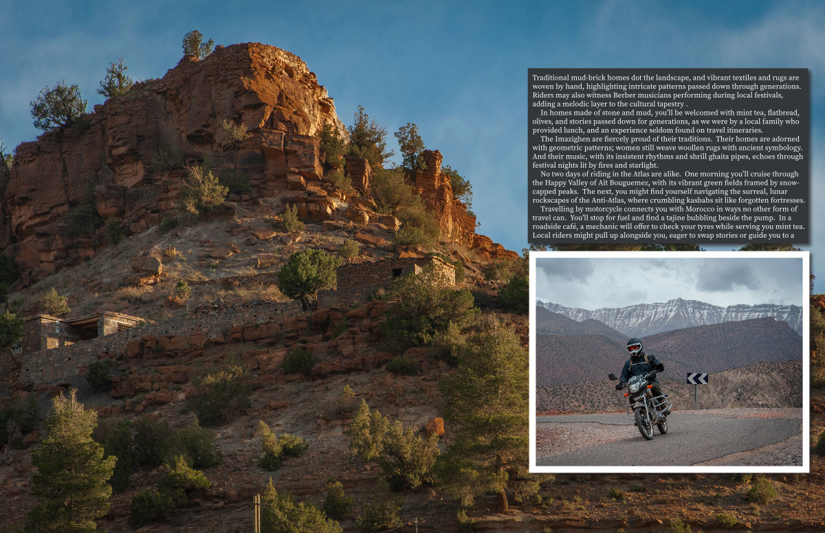 Travelling by motorcycle connects you with Morocco in ways no other form of travel can. You’ ll stop for fuel and find a tajine bubbling beside the pump. In a roadside café, a mechanic will offer to check your tyres while serving you mint tea. Local riders might pull up alongside you, eager to swap stories or guide you to a