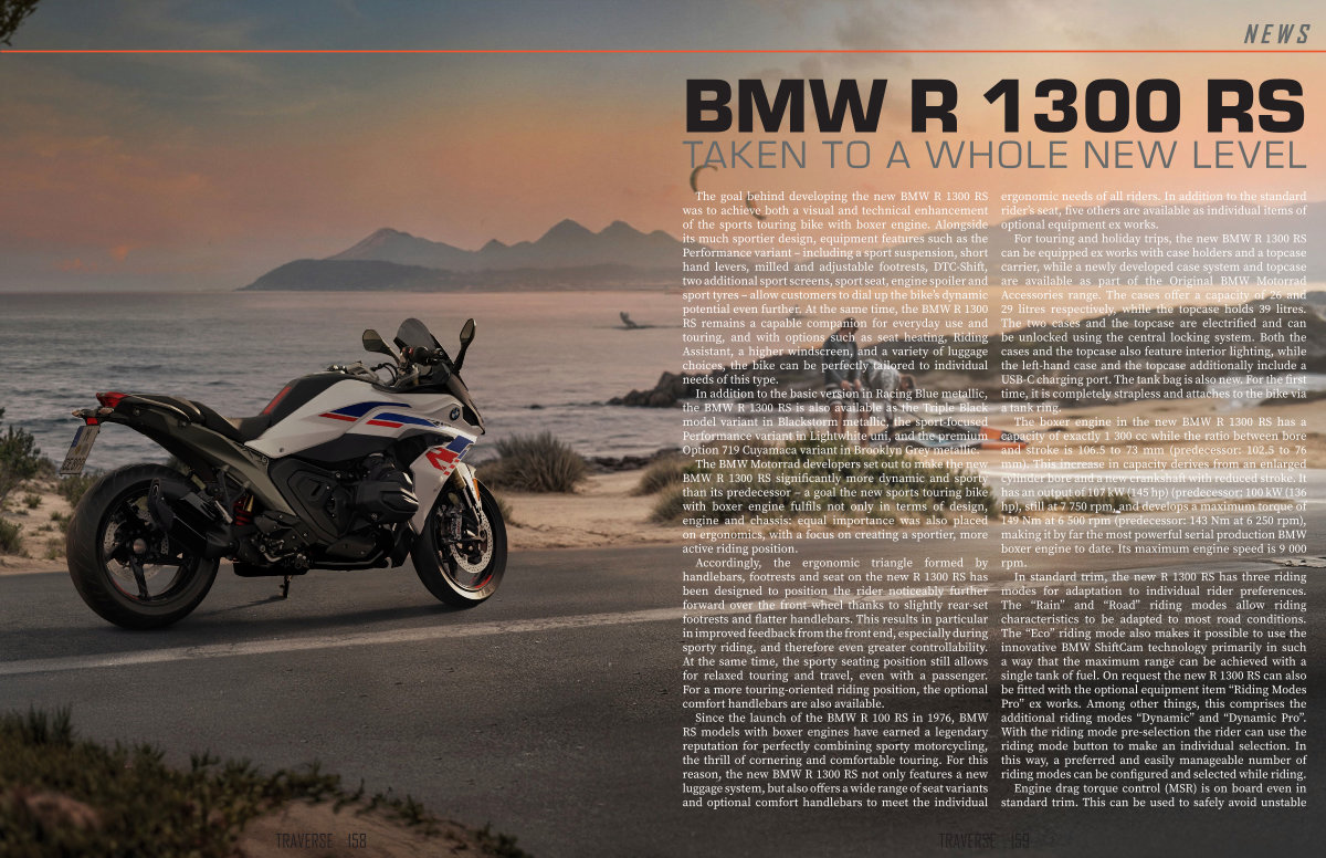 The goal behind developing the new BMW R 1300 RS was to achieve both a visual and technical enhancement of the sports touring bike with boxer engine. Alongside its much sportier design, equipment features such as the Performance variant – including a sport suspension, short hand levers, milled and adjustable footrests, DTC-Shift, two additional sport screens, sport seat, engine spoiler and sport tyres – allow customers to dial up the bike’ s dynamic potential even further. At the same time, the BMW R 1300 RS remains a capable companion for everyday use and touring, and with options such as seat heating, Riding Assistant, a higher windscreen, and a variety of luggage choices, the bike can be perfectly tailored to individual needs of this type.