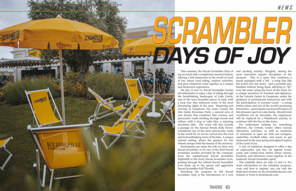 This summer, the Ducati Scrambler Days of Joy are back with a completely renewed format, offering a full immersion in the world of Land of Joy, where road riding, outdoor activities, and pure relaxation come together in a unique and immersive experience.