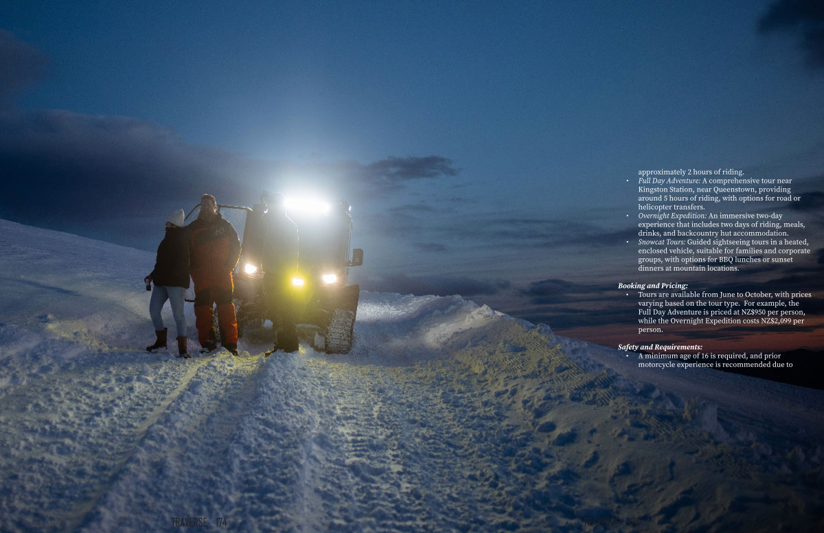 • Overnight Expedition: An immersive two-day experience that includes two days of riding, meals, drinks, and backcountry hut accommodation.