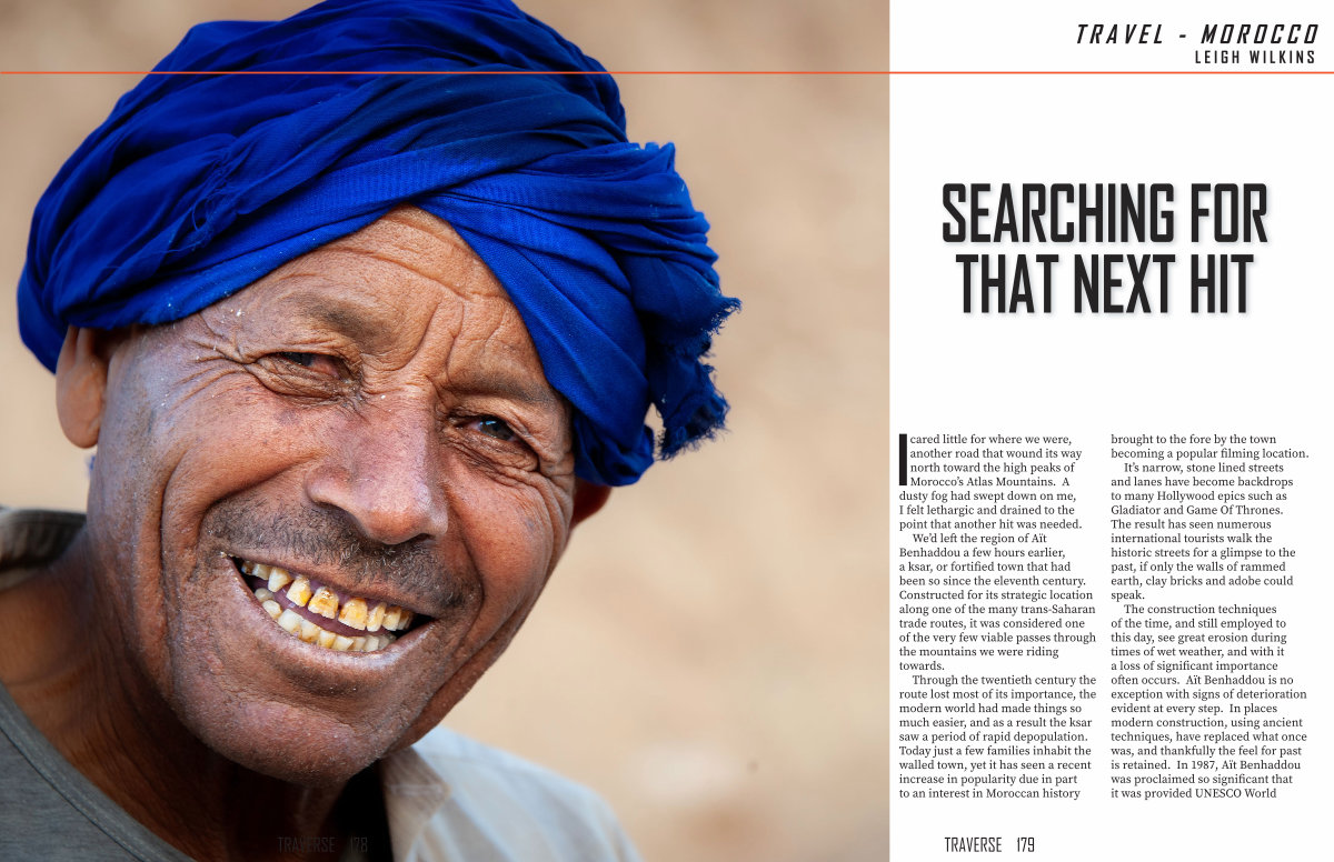 We’ d left the region of Aït Benhaddou a few hours earlier, a ksar, or fortified town that had been so since the eleventh century. Constructed for its strategic location along one of the many trans-Saharan trade routes, it was considered one of the very few viable passes through the mountains we were riding towards.