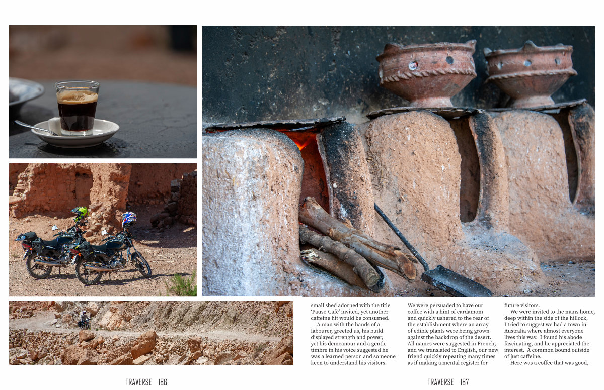 We were persuaded to have our coffee with a hint of cardamom and quickly ushered to the rear of the establishment where an array of edible plants were being grown against the backdrop of the desert. All names were suggested in French, and we translated to English, our new friend quickly repeating many times as if making a mental register for future visitors.