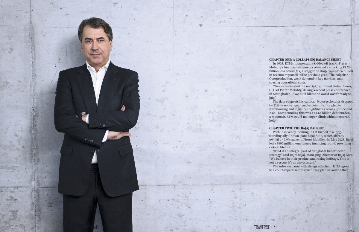 The data supports his candor. Motorcycle sales dropped by 21 % year-over-year, and excess inventory led to warehousing and logistical nightmares across Europe and Asia. Compounding this was a € 1.64 billion debt burden, a mountain KTM could no longer climb without external help.