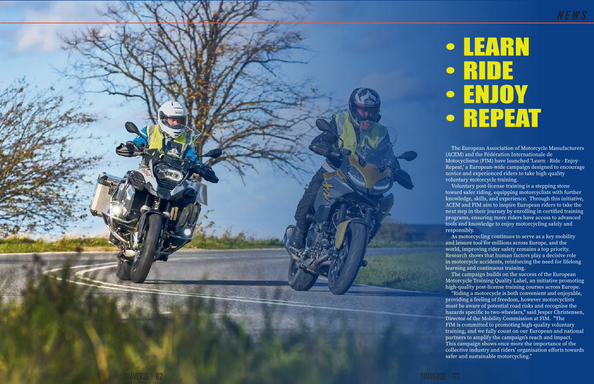 The European Association of Motorcycle Manufacturers( ACEM) and the Fédération Internationale de Motocyclisme( FIM) have launched‘ Learn- Ride- Enjoy- Repeat,’ a European-wide campaign designed to encourage novice and experienced riders to take high-quality voluntary motorcycle training.