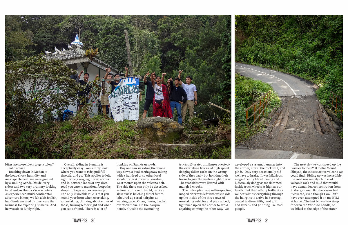 bikes are more likely to get stolen.” Solid advice. Touching down in Medan to the body-shock humidity and inescapable heat, we were greeted by a smiling Ganda, his delivery riders and two very ordinary-looking twist and go Honda Vario scooters. As experienced multi-continental adventure bikers, we felt a bit foolish, but Ganda assured us they were the business for exploring Sumatra. And he was ab-so-lutely right.