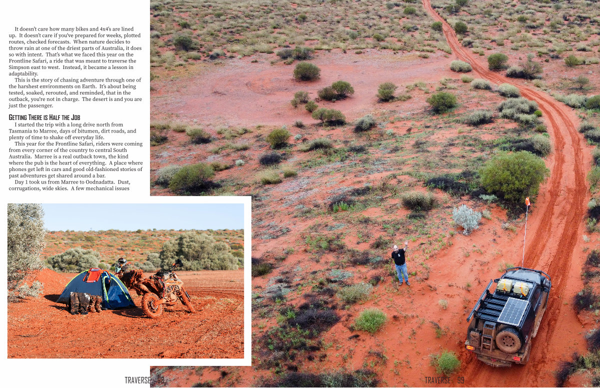 It doesn’ t care how many bikes and 4x4’ s are lined up. It doesn’ t care if you ' ve prepared for weeks, plotted routes, checked forecasts. When nature decides to throw rain at one of the driest parts of Australia, it does so with intent. That’ s what we faced this year on the Frontline Safari, a ride that was meant to traverse the Simpson east to west. Instead, it became a lesson in adaptability.