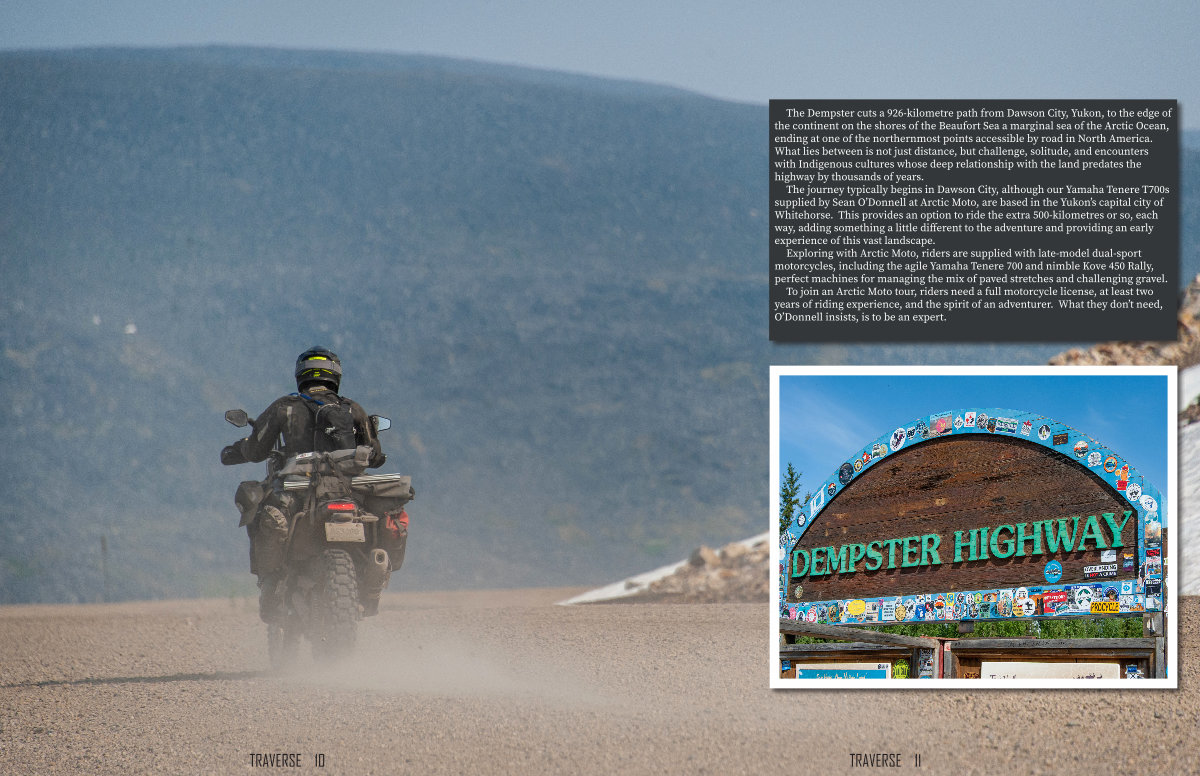 The journey typically begins in Dawson City, although our Yamaha Tenere T700s supplied by Sean O’ Donnell at Arctic Moto, are based in the Yukon’ s capital city of Whitehorse. This provides an option to ride the extra 500-kilometres or so, each way, adding something a little different to the adventure and providing an early experience of this vast landscape.