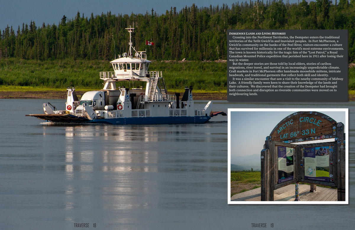 It was a similar encounter that saw a visit to the nearby community of Midway Lake. A friendly family were keen to share their knowledge of the lands and their cultures. We discovered that the creation of the Dempster had brought both connection and disruption as riverside communities were moved on to neighbouring lands.