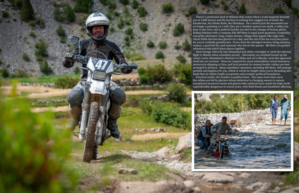 There’ s a particular kind of stillness that comes when a road unspools beneath you at 3,000 metres and the horizon is nothing but a jagged row of teeth: the Karakoram, the Hindu Kush, the Himalaya. On a motorcycle the mountains are no longer a painting on a wall, they are a weather system you smell, a valley you hear in the river, and a political border you feel in the change of license plates. Riding Pakistan with a company like M8 Moto is equal parts geometry, hospitality, and gritty adventure: long, empty tarmac; villages that appear like stage sets; wheat fields that become glaciers in a day; and the red of the tea everyone pours for you in roadside guesthouses. If you want the abridged version: bring stamina, respect, a good kit list, and someone who knows the passes. M8 Moto run guided adventures that stitch these places together.