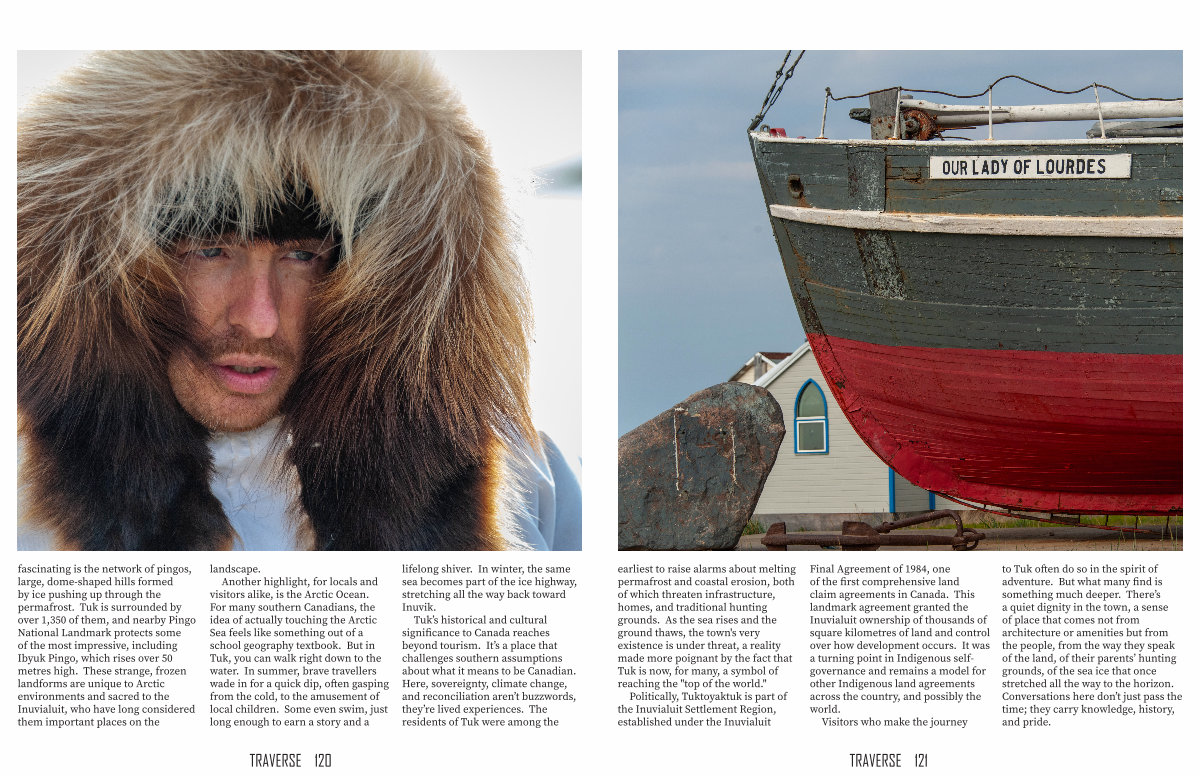 Final Agreement of 1984, one of the first comprehensive land claim agreements in Canada. This landmark agreement granted the Inuvialuit ownership of thousands of square kilometres of land and control over how development occurs. It was a turning point in Indigenous selfgovernance and remains a model for other Indigenous land agreements across the country, and possibly the world.