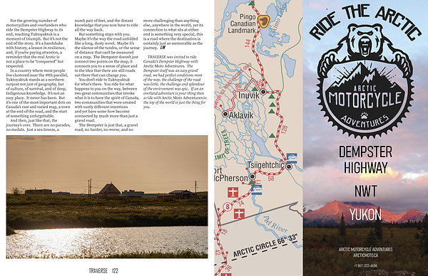 TRAVERSE was invited to ride Canada ' s Dempster Highway with Arctic Moto Adventures. The Dempster itself was an easy gravel road, we had perfect conditions most of the way, the challenge of the road was little, the challenge and splendour of the environment was epic. If an an overland adventure is your thing then a ride with Arctic Moto Adventures to the top of the world is just the thing for you.