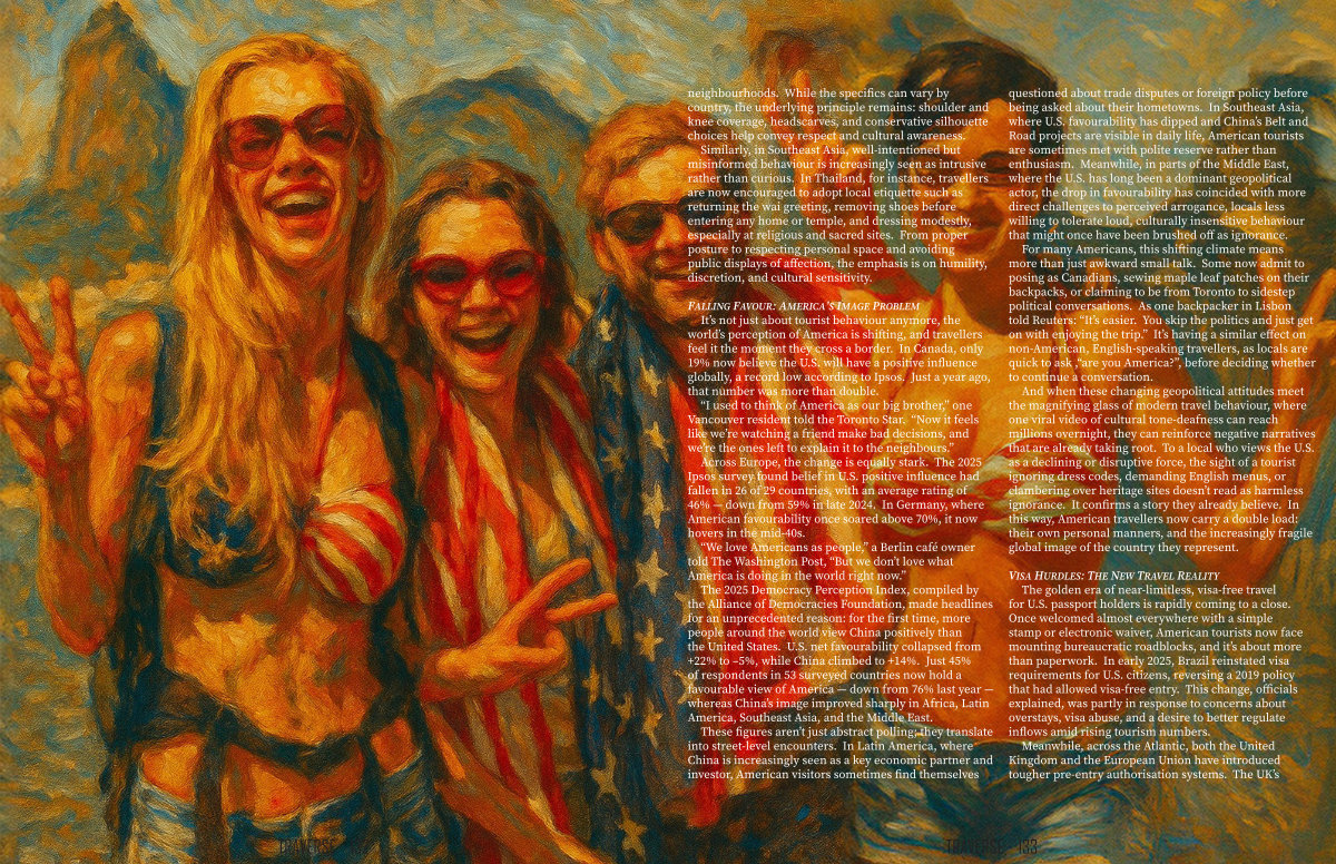 These figures aren’ t just abstract polling; they translate into street-level encounters. In Latin America, where China is increasingly seen as a key economic partner and investor, American visitors sometimes find themselves questioned about trade disputes or foreign policy before being asked about their hometowns. In Southeast Asia, where U. S. favourability has dipped and China’ s Belt and Road projects are visible in daily life, American tourists are sometimes met with polite reserve rather than enthusiasm. Meanwhile, in parts of the Middle East, where the U. S. has long been a dominant geopolitical actor, the drop in favourability has coincided with more direct challenges to perceived arrogance, locals less willing to tolerate loud, culturally insensitive behaviour that might once have been brushed off as ignorance.