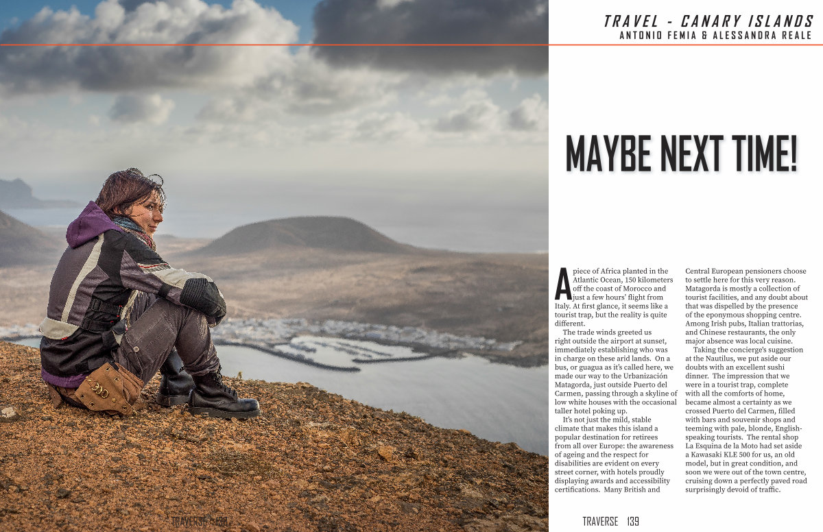 Taking the concierge ' s suggestion at the Nautilus, we put aside our doubts with an excellent sushi dinner. The impression that we were in a tourist trap, complete with all the comforts of home, became almost a certainty as we crossed Puerto del Carmen, filled with bars and souvenir shops and teeming with pale, blonde, Englishspeaking tourists. The rental shop La Esquina de la Moto had set aside a Kawasaki KLE 500 for us, an old model, but in great condition, and soon we were out of the town centre, cruising down a perfectly paved road surprisingly devoid of traffic.