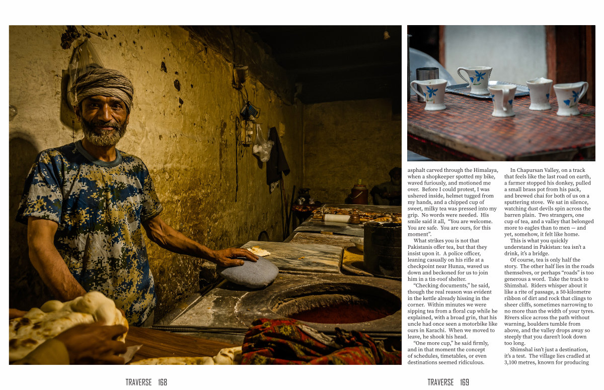 asphalt carved through the Himalaya, when a shopkeeper spotted my bike, waved furiously, and motioned me over. Before I could protest, I was ushered inside, helmet tugged from my hands, and a chipped cup of sweet, milky tea was pressed into my grip. No words were needed. His smile said it all,“ You are welcome. You are safe. You are ours, for this moment”.