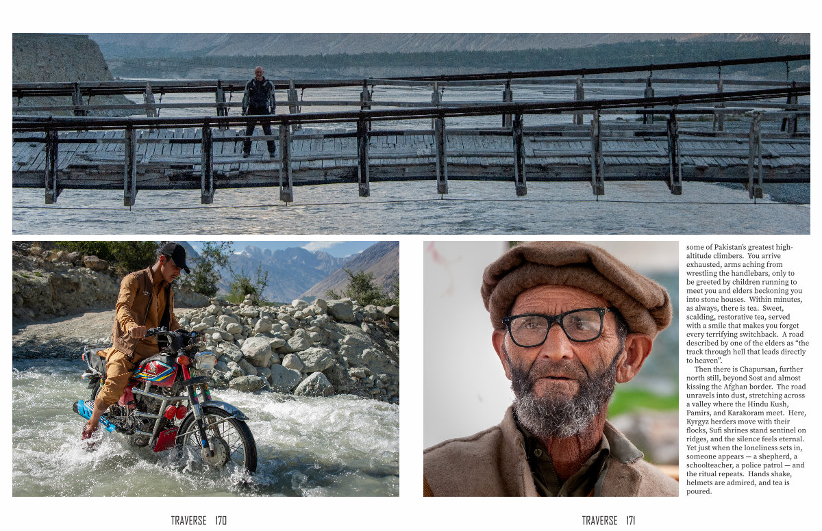 some of Pakistan’ s greatest highaltitude climbers. You arrive exhausted, arms aching from wrestling the handlebars, only to be greeted by children running to meet you and elders beckoning you into stone houses. Within minutes, as always, there is tea. Sweet, scalding, restorative tea, served with a smile that makes you forget every terrifying switchback. A road described by one of the elders as“ the track through hell that leads directly to heaven”.