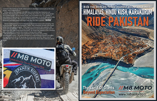 We joined David for a three week exploration of this unique and, at times, misunderstood country. We quickly developed an understandimg of David ' s love affair, placing Pakistan firmly in the top group of our favourite countries. Have a look at what M8 Moto has on offer and you too might fall for the charm that is Pakistan and its people.