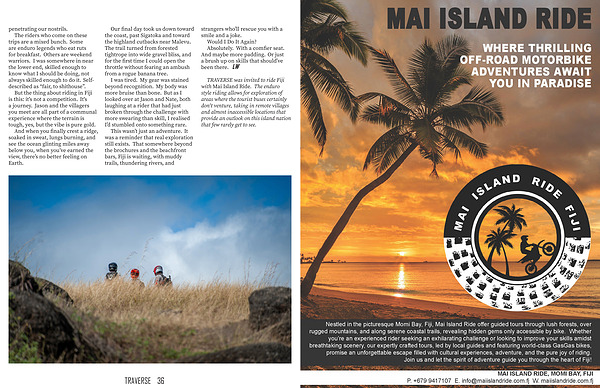TRAVERSE was invited to ride Fiji with Mai Island Ride. The enduro style riding allows for exploration of areas where the tourist buses certainly don ' t venture, taking in remote villages and almost inaccessible locations that provide an outlook on this island nation that few rarely get to see.