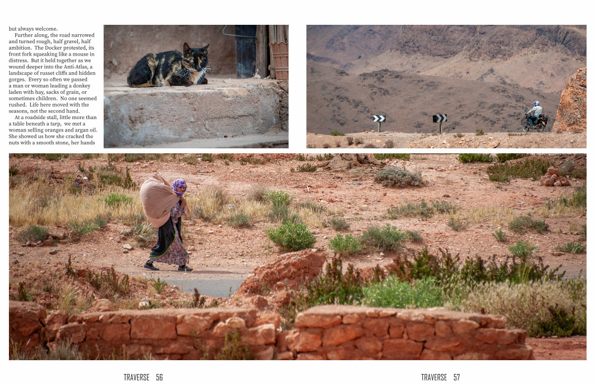 Further along, the road narrowed and turned rough, half gravel, half ambition. The Docker protested, its front fork squeaking like a mouse in distress. But it held together as we wound deeper into the Anti-Atlas, a landscape of russet cliffs and hidden gorges. Every so often we passed a man or woman leading a donkey laden with hay, sacks of grain, or sometimes children. No one seemed rushed. Life here moved with the seasons, not the second hand.